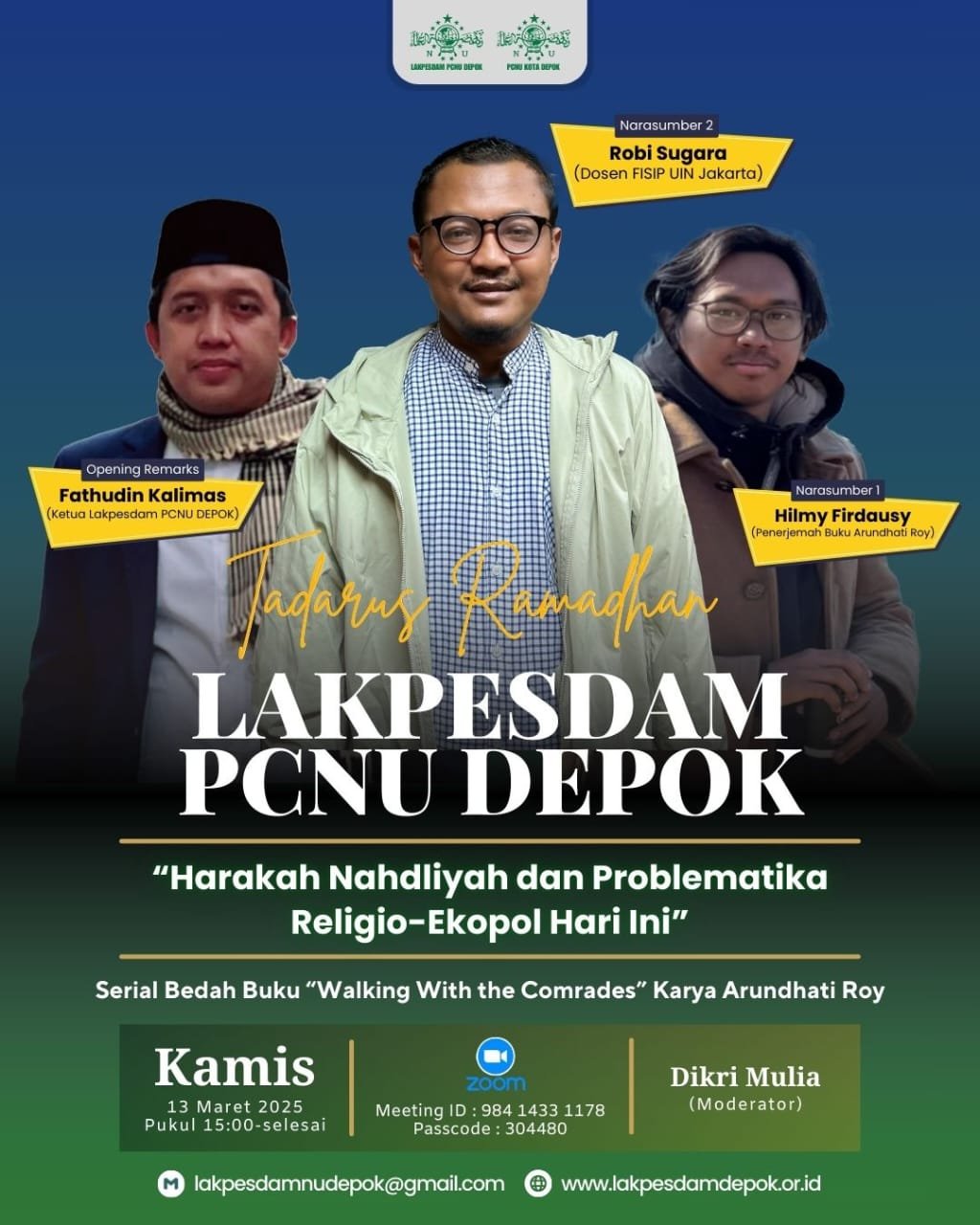 Depok, 14 Maret 2025 – Lakpesdam PCNU Depok menggelar acara Tadarus Ramadhan bertema “Harakah Nahdliyah dan Problematika Religio-Ekopol Hari Ini”. Agenda ini sekaligus menjadi forum bedah buku “Walking With Comrades”karya Arundhati Roy, yang dikupas lebih dalam oleh para narasumber guna menyoroti persoalan sosial kontemporer di Indonesia.